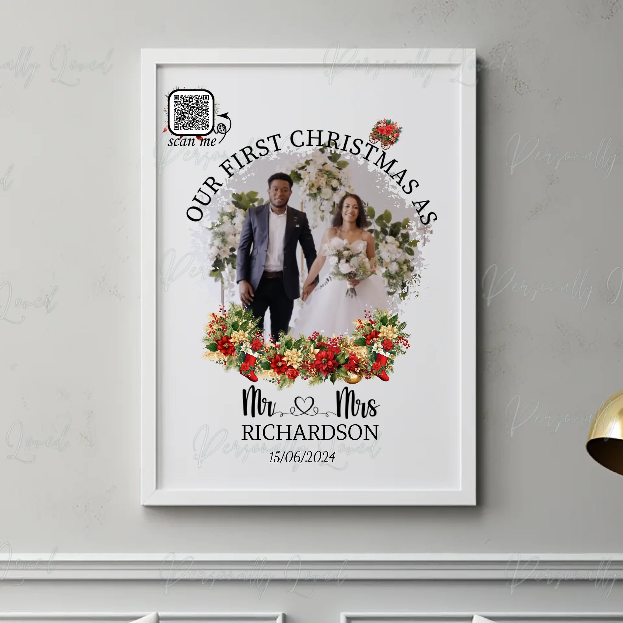 Celebrate Your First Christmas Together with Elegance Customisable framed poster with embedded video memories - a timeless keepsake that captures the essence of your love and the start of your lifelong journey together. QR...
